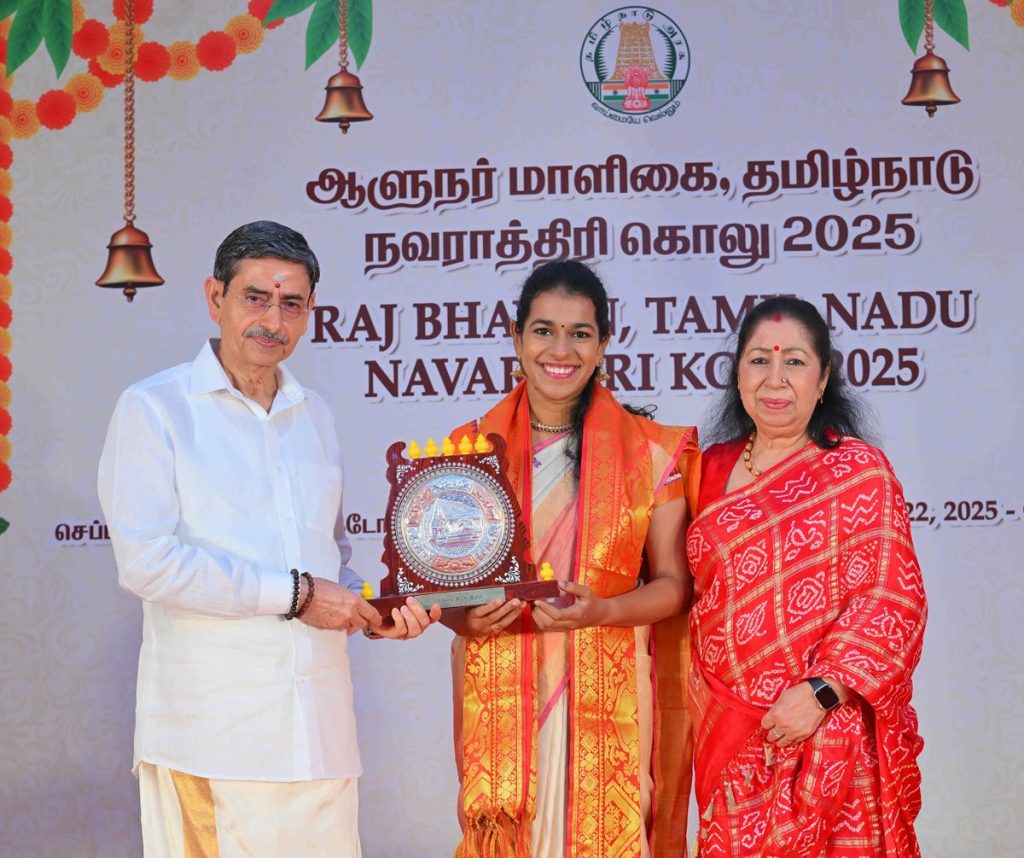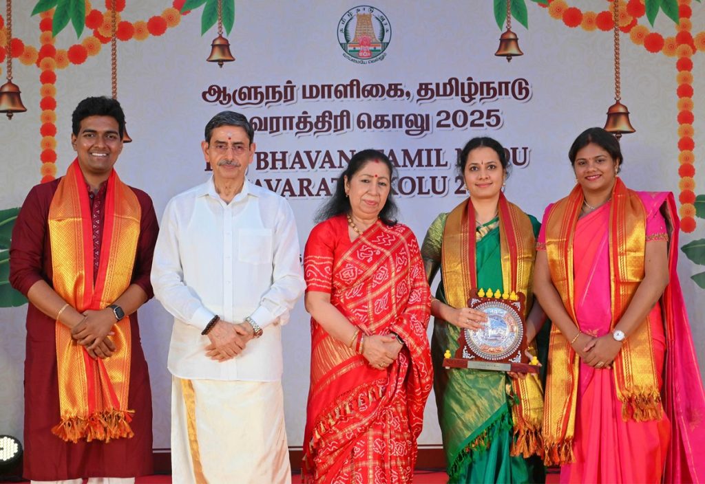 Thiru.R.N.Ravi, Hon’ble Governor of Tamil Nadu and Tmt.Laxmi Ravi, First Lady of Tamil Nadu, performed Navaratri Puja, witnessed and felicitated Tmt.Veena Venkatramani for Veena recital performances, Tmt. Anusha Girish and students for Bharatanatyam performance, Tmt. Maitrayee Badrinarayanan ,Carnatic Vocal Song performance and Members of Mayilai Raghumayi Raman Challengers Music Band, Chennai for their Bhajan performance on the occasion of Navaratri Kolu celebration at Raj Bhavan, Chennai - 01.10.2025. Hundreds of general public participated on the 10th and final day of Navaratri Kolu festival at Raj Bhavan, Chennai.