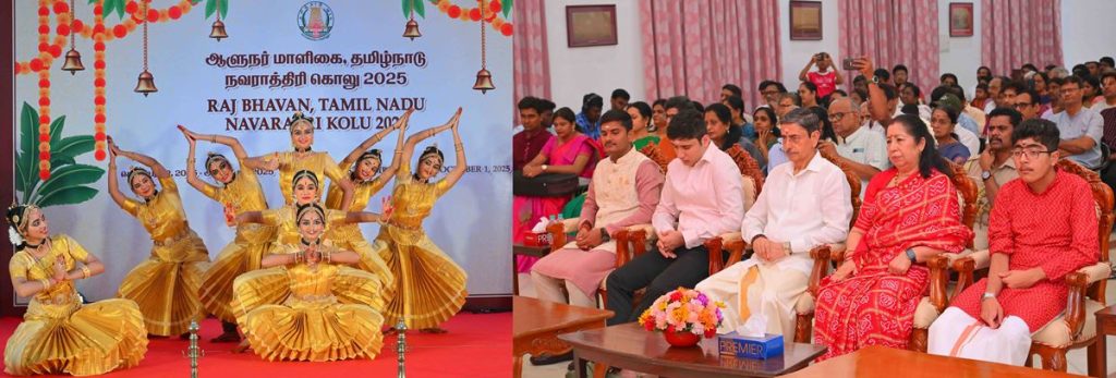 Thiru.R.N.Ravi, Hon’ble Governor of Tamil Nadu and Tmt.Laxmi Ravi, First Lady of Tamil Nadu, performed Navaratri Puja and witnessed the Veena recital by Tmt.Veena Venkatramani, Bharatanatyam performance of students of Tmt. Anusha Girish and Carnatic Vocals by Tmt. Maitrayee Badrinarayanan on the occasion of Navaratri Kolu celebration at Raj Bhavan, Chennai - 01.10.2025. Hundreds of general public participated on the 10th and final day of Navaratri Kolu festival at Raj Bhavan, Chennai.