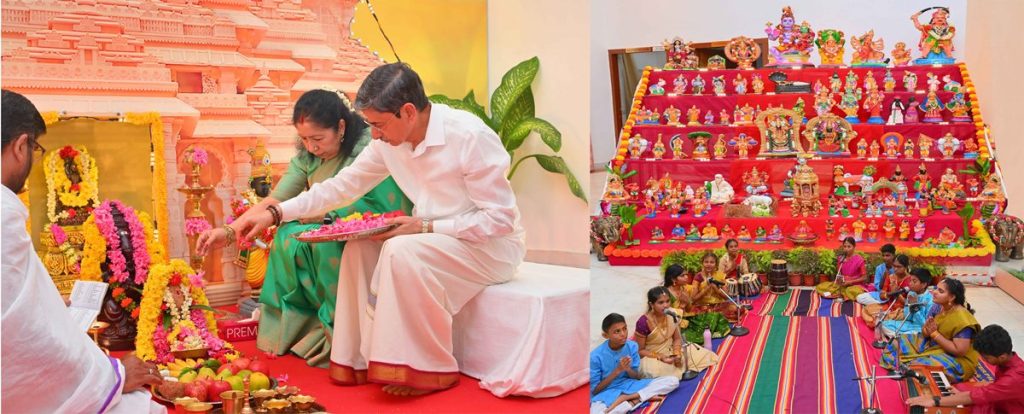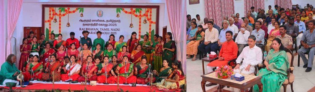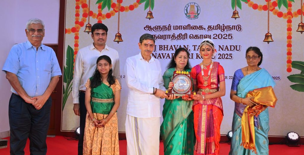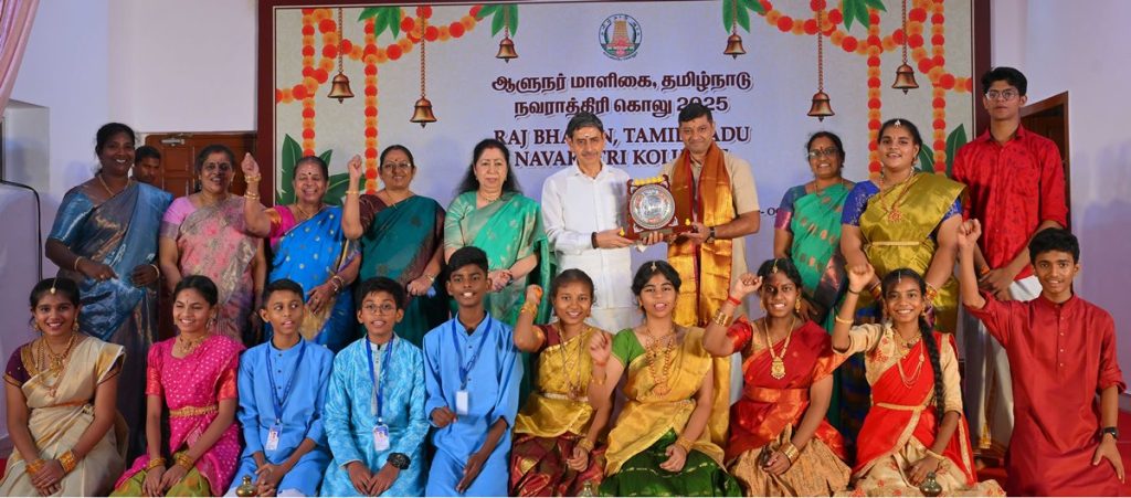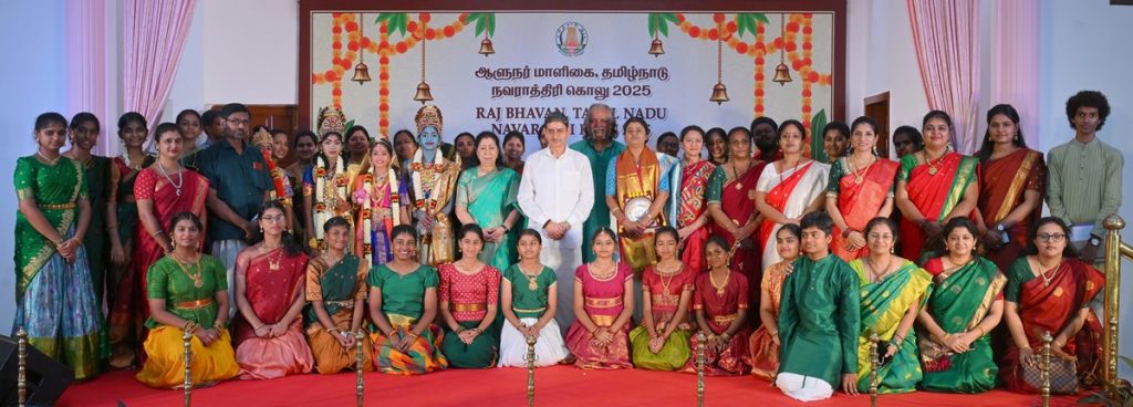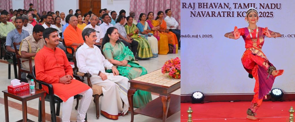 Thiru.R.N.Ravi, Hon’ble Governor of Tamil Nadu and Tmt.Laxmi Ravi, First Lady of Tamil Nadu, performed Navaratri Puja, witnessed and felicitated the students of Bridge Academy for Devotional song performances, Selvi.S.Drisya for Bharatanatyam performance and the students of Vivekananda Vidyalaya School, Vysarpadi, Chennai for their Bhajan performance on the occasion of Navaratri Kolu celebration at Raj Bhavan, Chennai - 29.09.2025. Hundreds of general public participated on the 8th day of Navaratri Kolu festival at Raj Bhavan, Chennai. With more than 2,400 present and over 16,000 joining virtually since day one, this vibrant celebration pulses with living devotion, rich culture, and joyous festivity, strengthening the oneness of our society and weaving a radiant tapestry of collective spirit and celebration.
