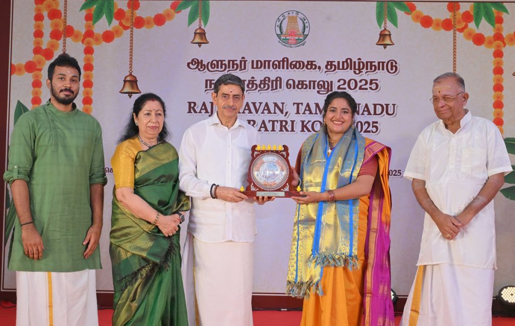 Thiru.R.N.Ravi, Hon’ble Governor of Tamil Nadu and Tmt.Laxmi Ravi, First Lady of Tamil Nadu, performed Navaratri Puja, witnessed and felicitated Selvi.V.U.M. Aishwarya, for her Carnatic Devotional Bhajan performance and Dr. Vijay Madhavan & team for their Bharatanatyam performance on the occasion of Navaratri Kolu celebration at Raj Bhavan, Chennai - 26.09.2025. Hundreds of general public participated on the 5th day of Navaratri Kolu festival at Raj Bhavan, Chennai.