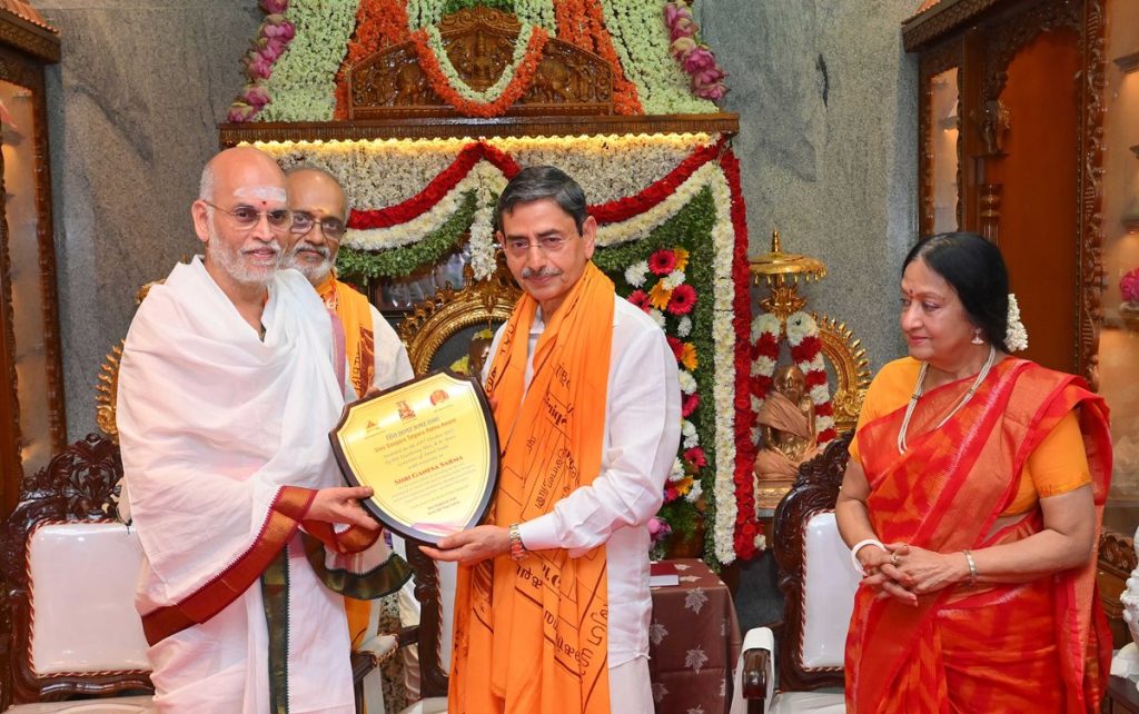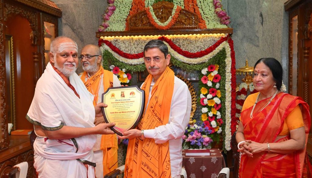 Thiru. R.N.Ravi, Hon'ble Governor of Tamil Nadu, participated as chief guest and presented 'Siva Saagara Tatpara Ratna' award to Govindapuram Thiru. Balaji Bhagavathar and Thiru. Ganesa Sarma at the Navaratri 2025 celebration organised by Sri Sivan SAR Yoga Sabhai & Siva Saagaram Trust held at Sri Sivan SAR Yoga Sabhai, Nanganallur, Chennai - 03.10.2025. Padma Vibhushan Padma Subrahmanyam, and other dignitaries were present.