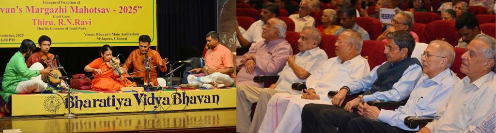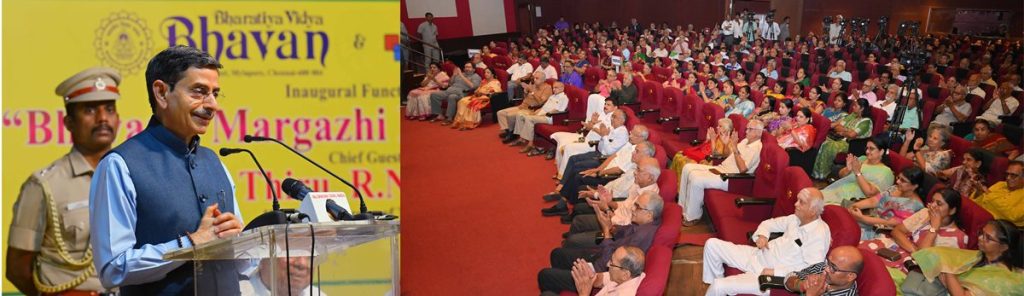 Thiru. R.N. Ravi, Hon’ble Governor of Tamil Nadu inaugurated the Bhavan’s Margazhi Mahotsav – 2025 and addressed the gathering at the Bhavan’s Pottipati Gnanamba Obul Reddy Auditorium – 20.11.2025