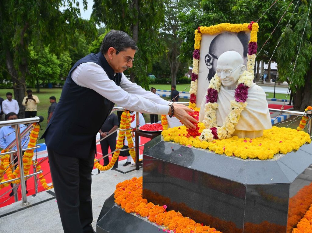 Thiru. R.N.Ravi, Hon'ble Governor of Tamil Nadu paid floral tribute to the statue of Mahatma Gandhi on the occasion of Gandhi Jayanthi at Gandhi Mandapam, Guindy, Chennai - 02.10.2025.